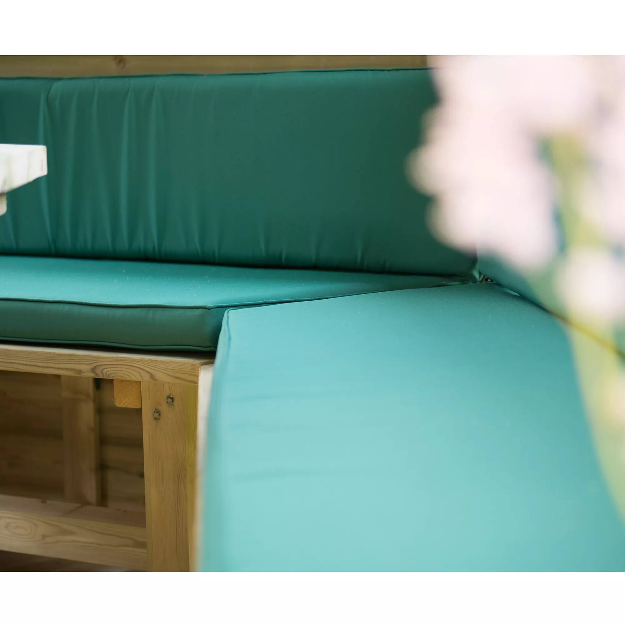 - Includes set of 5 custom made green seat and back bench cushions