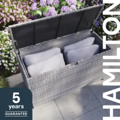 Sleek, simple and helps you keep your outdoor space organised with ease! The Hamilton storage box contains room for keeping all your sofa/seating essentials together and protected from the elements when not in use. This storage box will match effortlessly with existing Hamilton garden furniture sets and help preserve the quality of your cushions for use season after season.