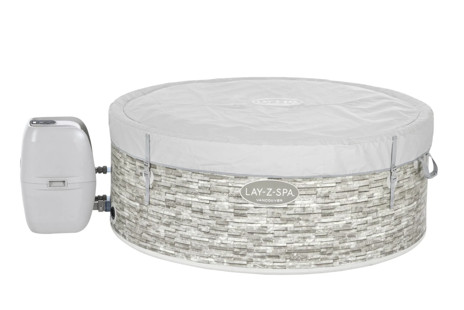 The Lay-Z-Spa Vancouver AirJet plus can accommodate up to 5 adults and offers a targetted 140 AirJet massage system with 2 intensity levels. Made from premium ultra-strong grey tile-print Drop Stitch material, the Vancouver AirJet is a stylish and compact hot tub for small spaces. It features a rapid heating system, power-saving timer and Freeze Shield™ technology for use all year round. It comes with a digitally controlled pump with cup holders, ChemConnect™ dispenser, insulating lid and cover with safety clips.